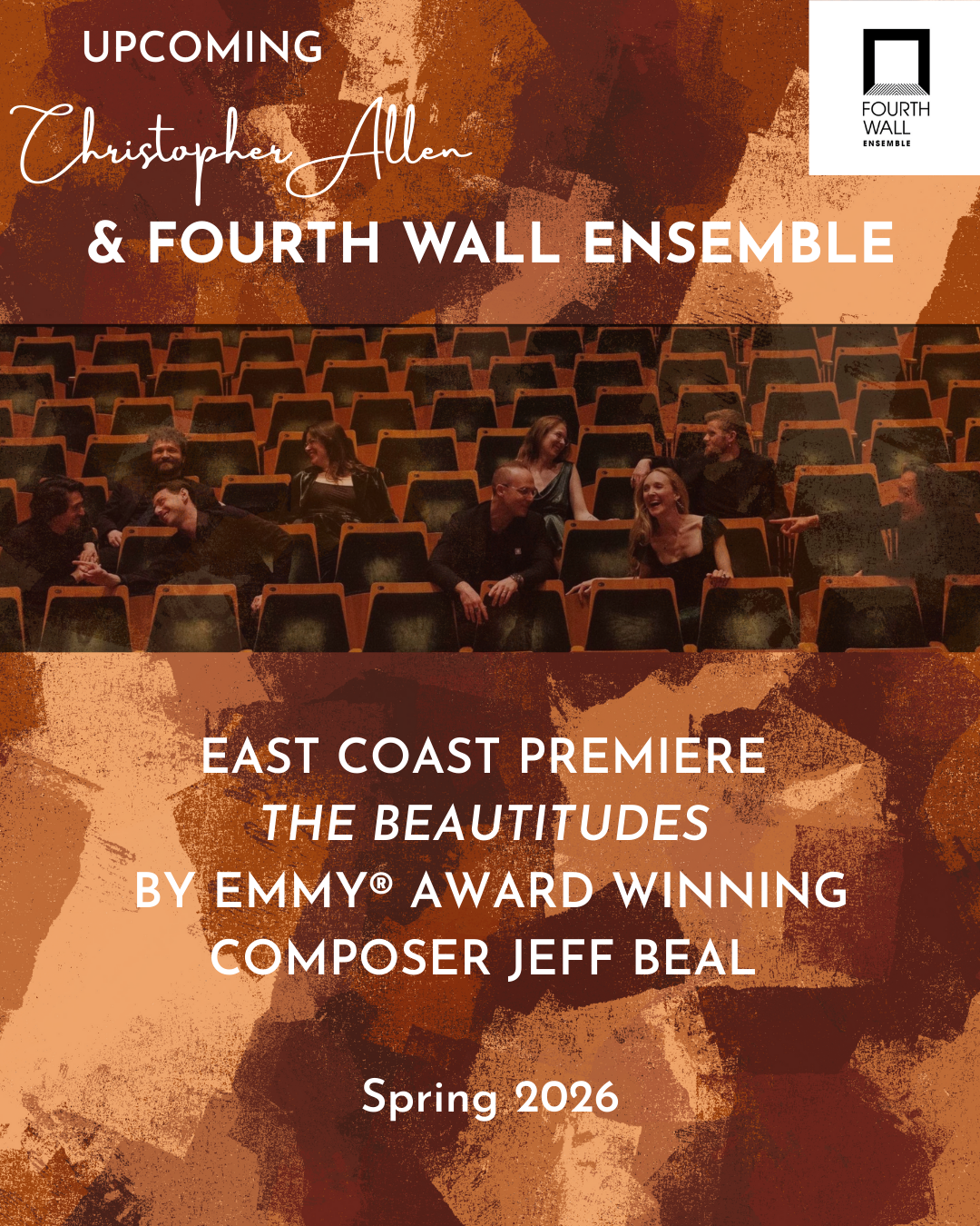 In January 2026, Fourth Wall Ensemble presented Dark Sky in partnership with the San Francisco Exploratorium. This performance featured the ensemble, Christopher Allen, and sound artist Phil Moffa. Coming Spring 2026, Fourth Wall will present the East Coast premiere of The Beatitudes, composed by EMMYÒ Award-winning composer Jeff Beal (Rome, Monk). Inspired by the Beatitudes from the Sermon on the Mount, this new work showcases the power of the human voice.