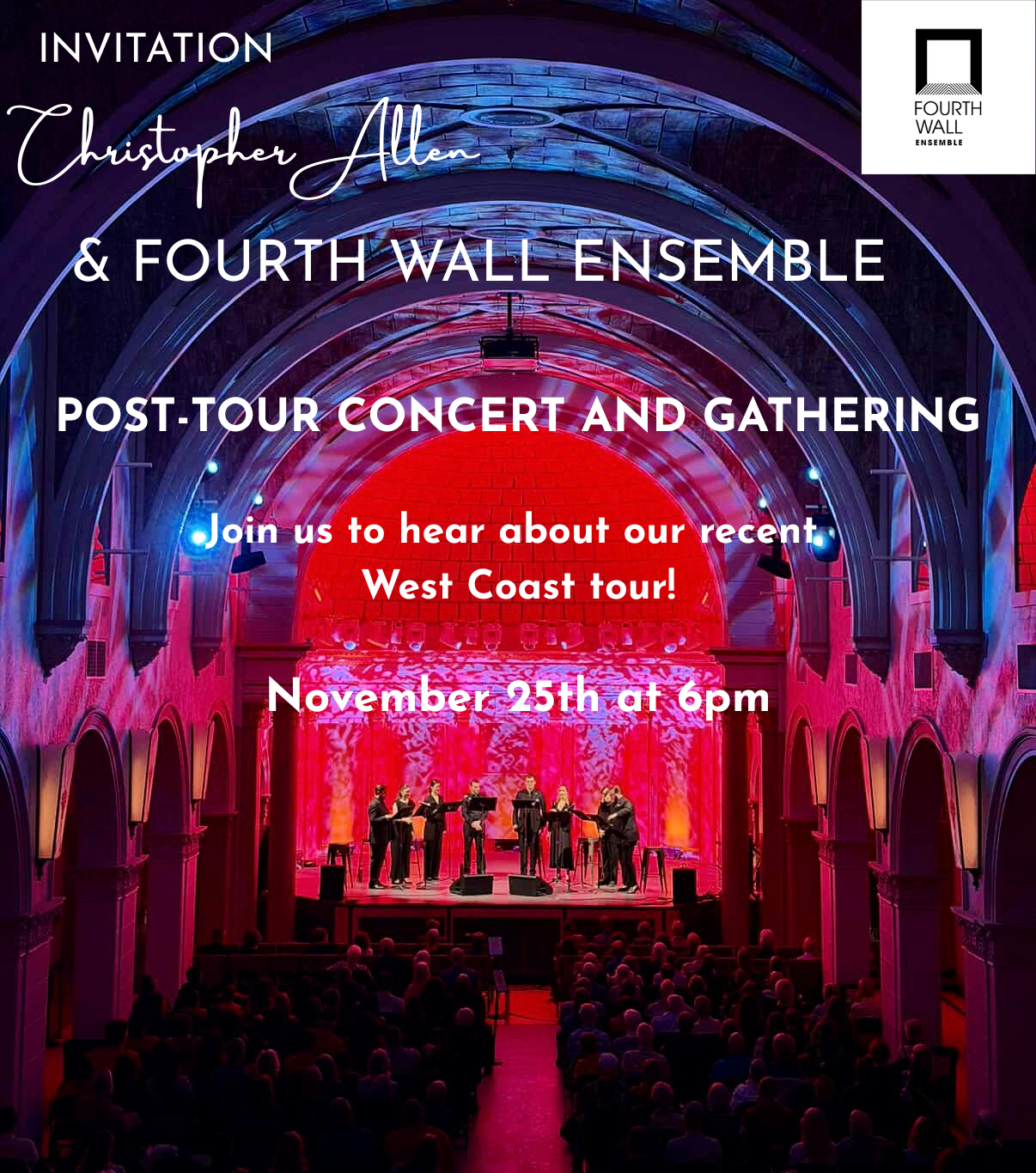 After an inspiring West Coast tour, Fourth Wall Ensemble is back in NYC — and we’d love to share the music, the stories, and the momentum with our closest friends and supporters. This intimate concert and gathering will feature selections from the tour performed by the ensemble and led by Artistic Director Christopher Allen
