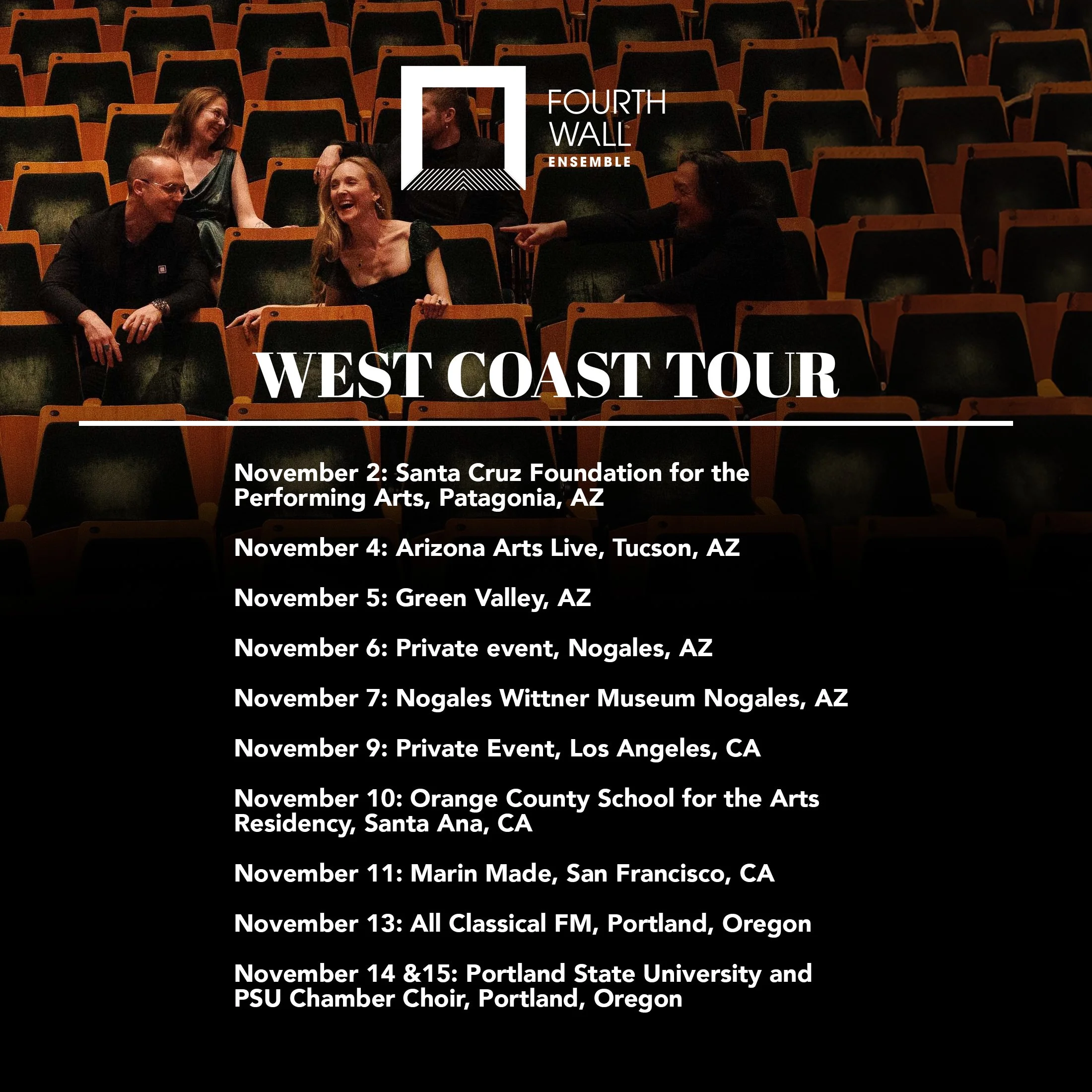 Fourth Wall Ensemble, led by Christopher Allen, embarks on its first West Coast Tour, bringing its signature blend of early and contemporary vocal music to audiences across Arizona and Oregon.